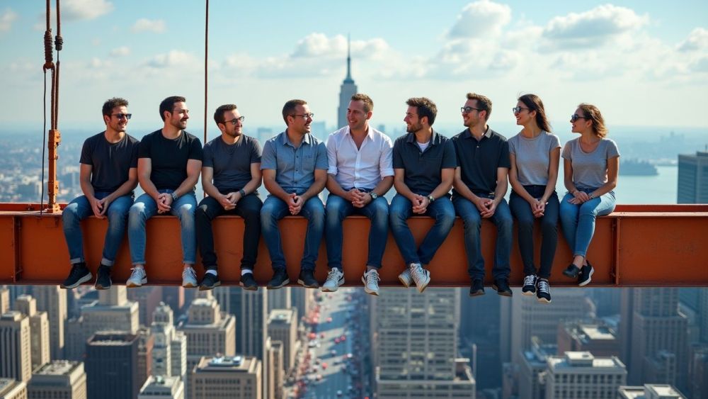 La doble portada de Time juega con una metáfora poderosa. Una ilustración muestra las letras AI sostenidas por andamios, como si fueran un rascacielos en construcción. En la otra, los protagonistas aparecen sentados sobre una viga metálica, en una recreación deliberada de la mítica foto de los obreros del Rockefeller Center en 1932. Entonces, construían edificios. Ahora, construyen mundos.