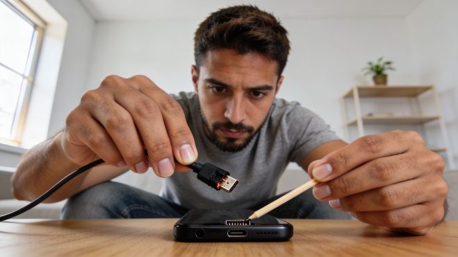 La solución es sencilla. Puedes limpiarlo usando un palillo de madera, pasándolo con suavidad por los bordes del puerto. Nunca uses objetos metálicos, que podrían rayar los contactos o provocar un cortocircuito. Y si sospechas que ha entrado humedad, lo mejor es dar golpecitos suaves contra la palma de la mano para expulsar el líquido y dejar el dispositivo en un lugar ventilado. Nunca introduzcas algodón, clips u otros objetos podrías empujar el agua hacia el interior y causar más daño.